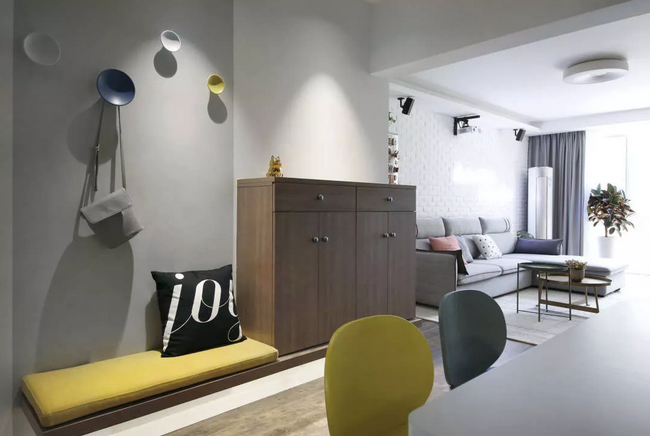 換鞋座與鞋柜都做了掛墻式,沒(méi)有落地柜腳的障礙,掃地擦地順暢很多;由于門廳光線弱,柜體離地也有利于客廳的光線更多的傳遞到門廳。當(dāng)然輔助光源一樣不可少。