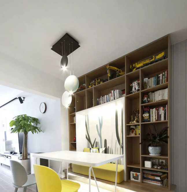 餐廳的位置比較暗,運(yùn)用隱藏式輔助光源改善光感,軟裝采用綠色與黃色做點(diǎn)綴賦予生機(jī)感。墻面的異形置物架又能滿足儲(chǔ)物與展示的需求。