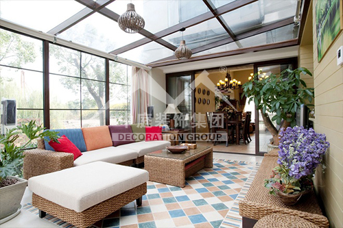 如果是陽臺面積較大又位于頂樓,應(yīng)該屬于“露臺”??稍陉柵_上加透明的弧形采光頂,就可使陽臺當作房間使用。陽光通過采光板灑向用文化石做的墻壁,以及青石板鋪成的地面,而且也照亮了“人”字型的鵝卵石小徑……這些園林造景手法,用在陽臺上,會給人濃濃的休閑氣息。