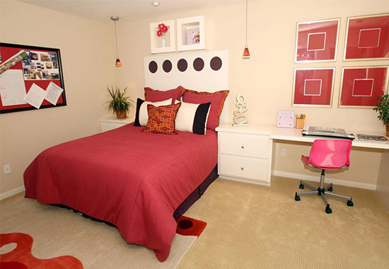 中國人認為紅色是吉祥色,新婚的喜房就都是滿眼紅彤彤的。紅色還具有熱情、奔放的含義,充滿燃燒的力量。但居室內(nèi)紅色過多會讓眼睛負擔(dān)過重,產(chǎn)生頭暈?zāi)垦5母杏X,即使是新婚,也不能長時間讓房間處于紅色的主調(diào)下。建議選擇紅色在軟裝飾上使用,比如窗簾、床品、靠包等,而用淡淡的米色或清新的白色搭配,可以使人神清氣爽,更能突出紅色的喜慶氣氛。
