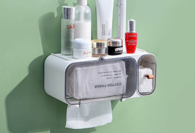 左邊是磁吸設(shè)計(jì),洗臉巾抽取式,輕松快捷;右邊是手拉式,方便增添化妝棉;右側(cè)面有掛鉤,可懸掛頭箍、手鏈、項(xiàng)鏈等物品;頂部置物,可放日常的護(hù)膚用品。