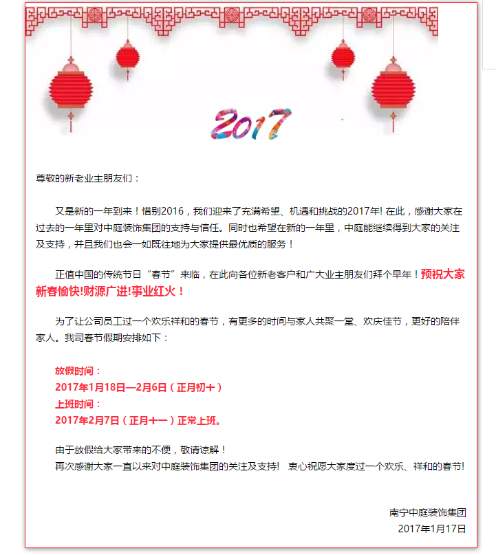 公告|中庭裝飾集團春節(jié)放假通知