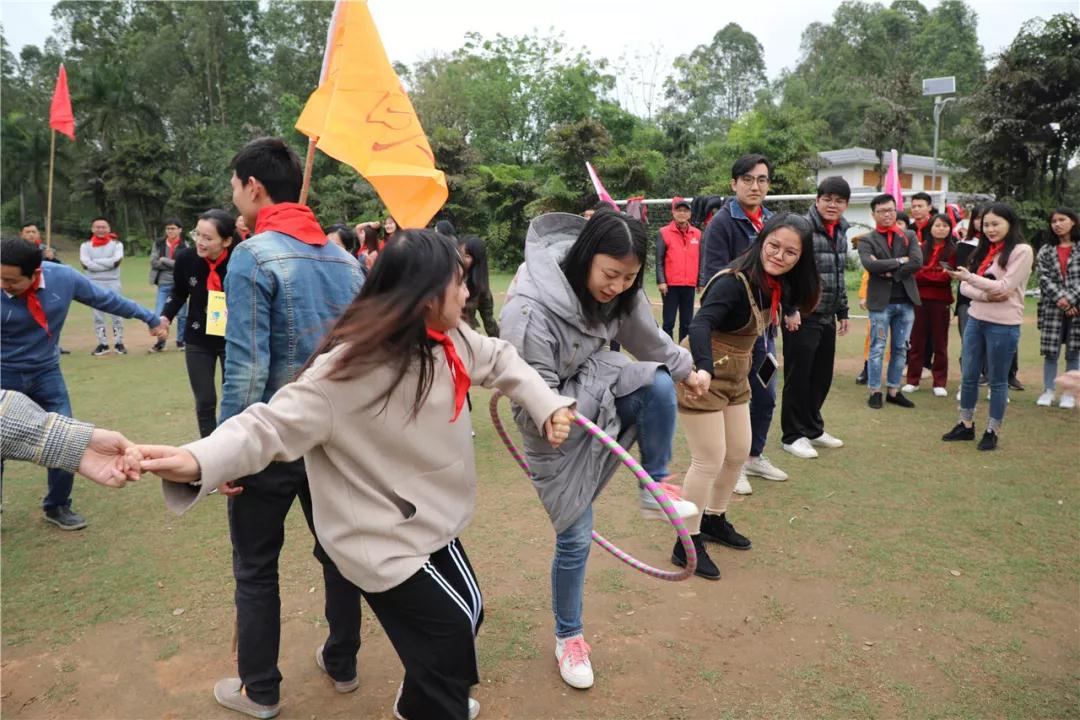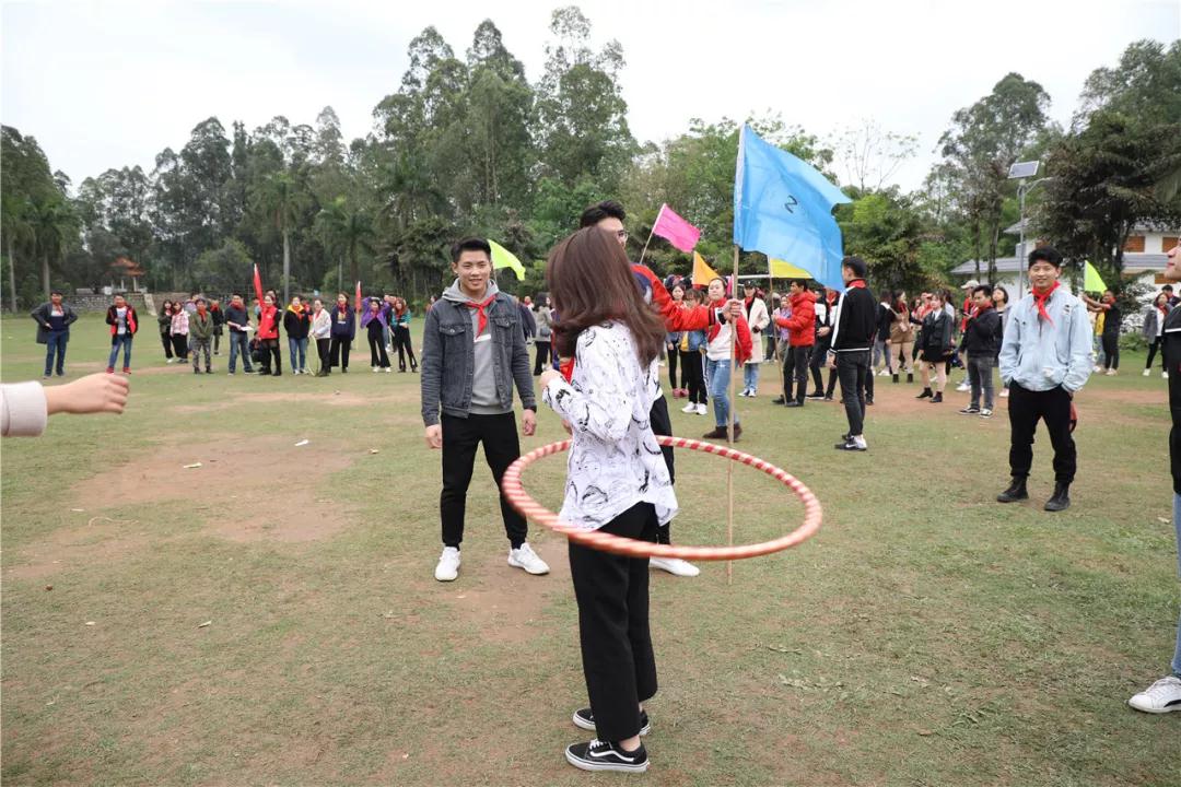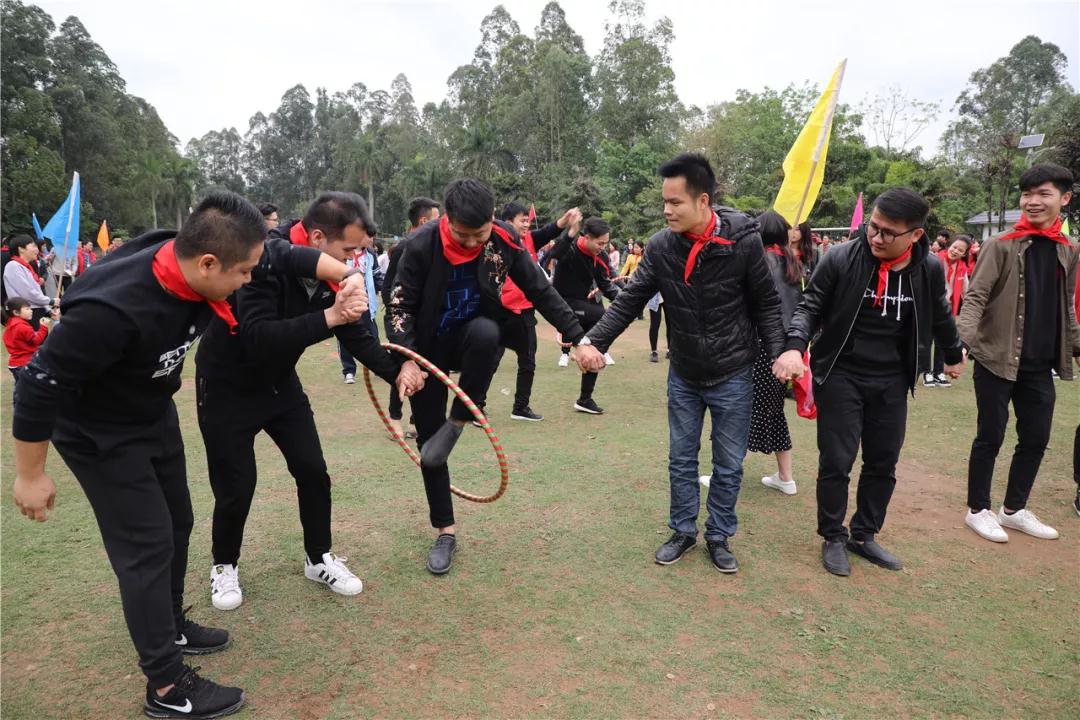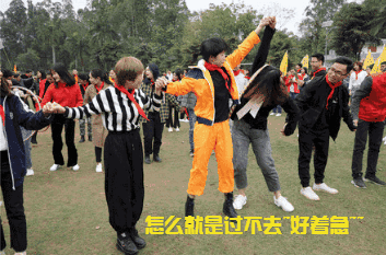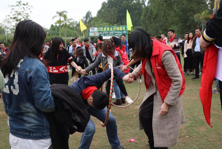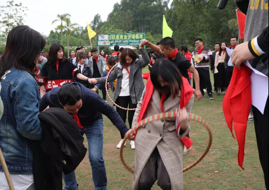 游戲規(guī)則:小組人員手牽手,從第一個人傳遞拉呼啦圈至最后一人,中途隊員不能放開手或者用手去接觸呼啦圈,否側(cè)重來,完成任務(wù)團隊。