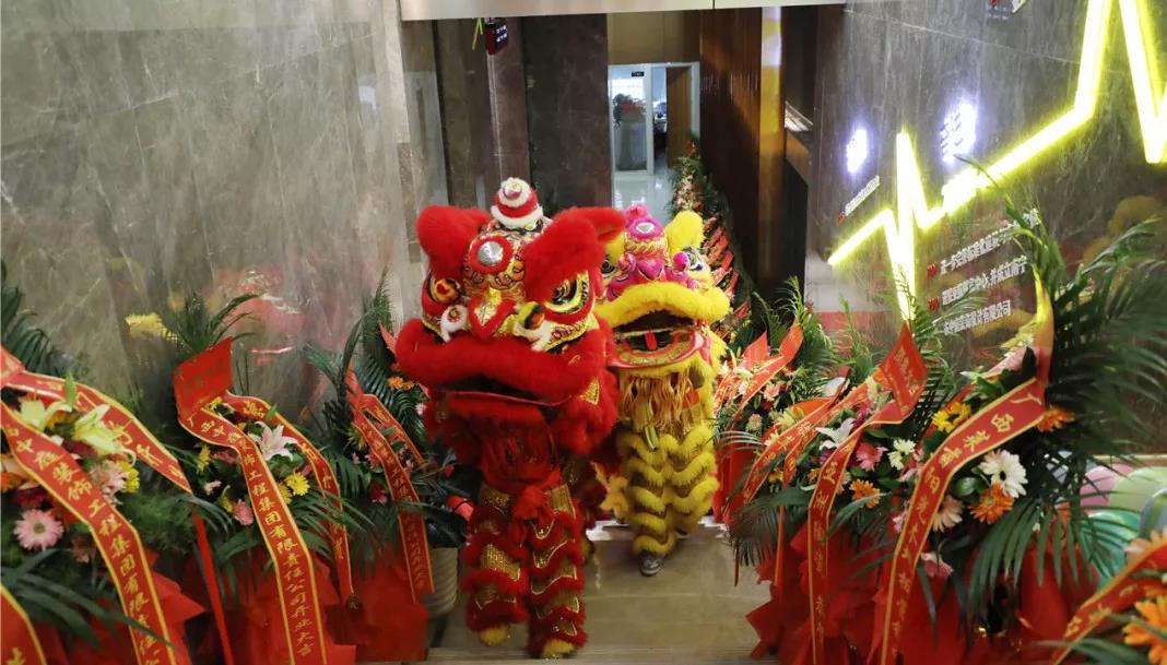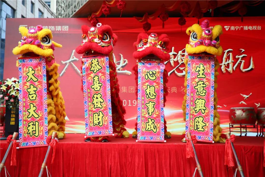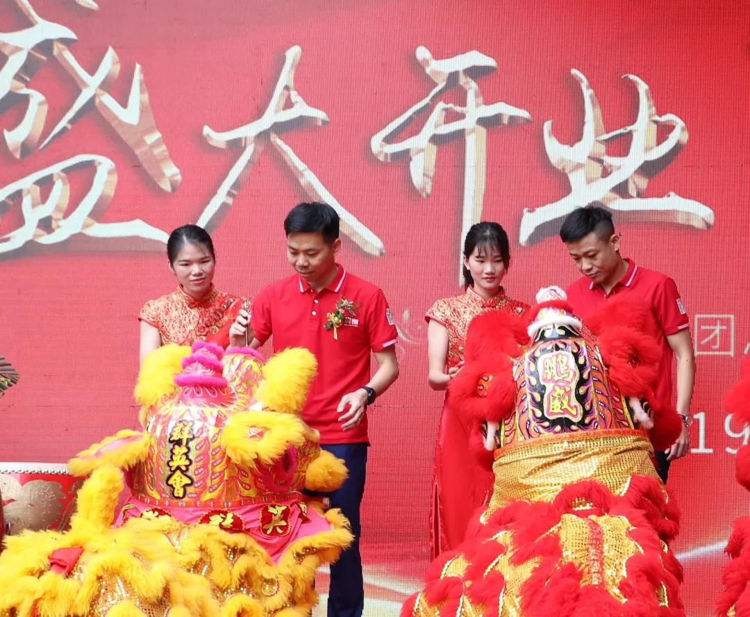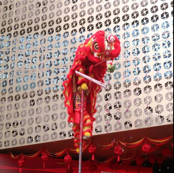 在鏗鏘有力、熱鬧非凡的鑼鼓聲中,火舞祥獅將寓意著“生財”的生菜送到集團總裁丁胡手中,為中庭裝飾集團獻上祥瑞的祝福。