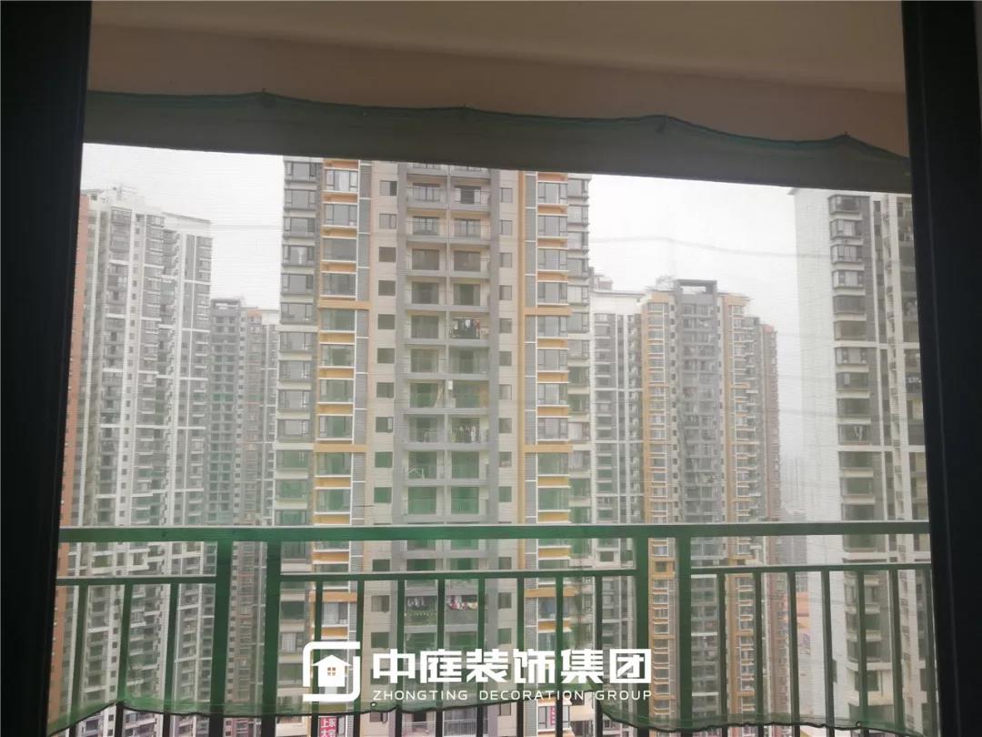 防護(hù)掛網(wǎng)懸掛到位。綠色防護(hù)掛網(wǎng),醒目的顏色為工人的施工安全保駕護(hù)航。細(xì)密的掛網(wǎng)也避免了在陽臺切割瓷磚時造成大量的灰塵飄逸出去,保護(hù)小區(qū)環(huán)境。