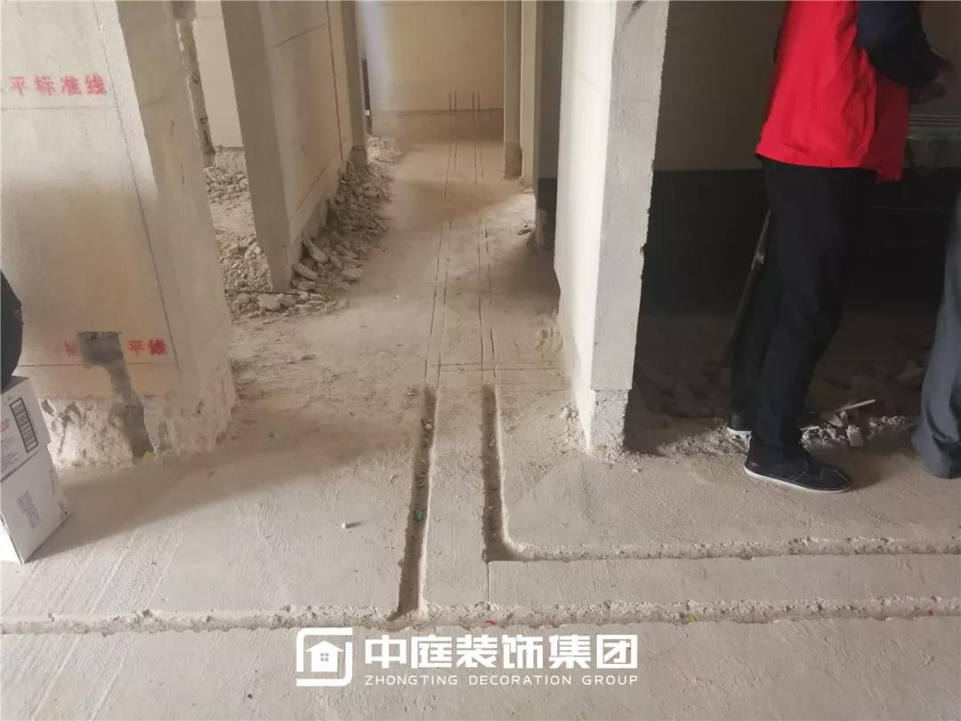 施工現(xiàn)場線管鋪設(shè)橫平豎直,按照集團(tuán)施工規(guī)定使用鐵皮卡扣固定,管和管之間留有足夠縫隙,以便鋪設(shè)地磚時水泥砂漿進(jìn)入管下,避免地磚后期出現(xiàn)空鼓。