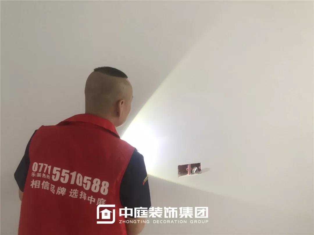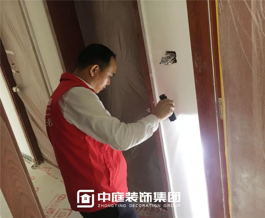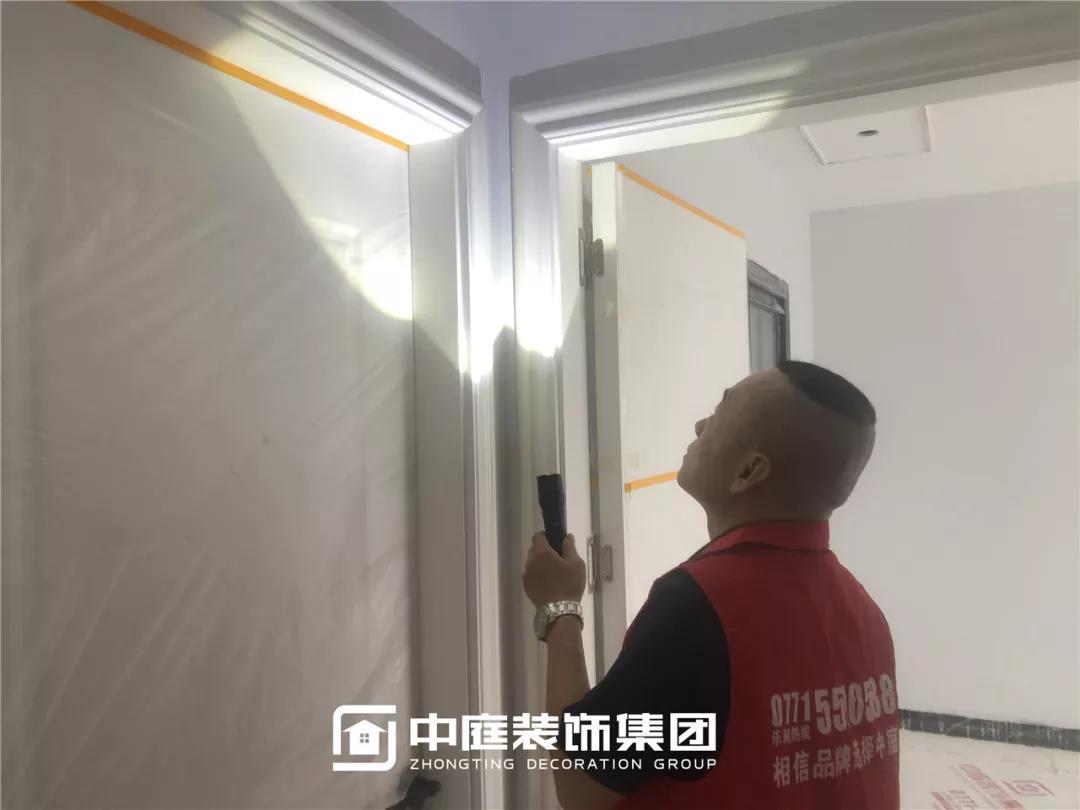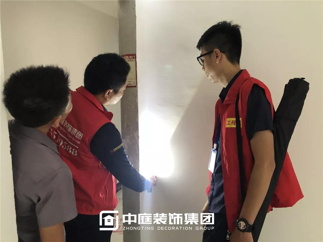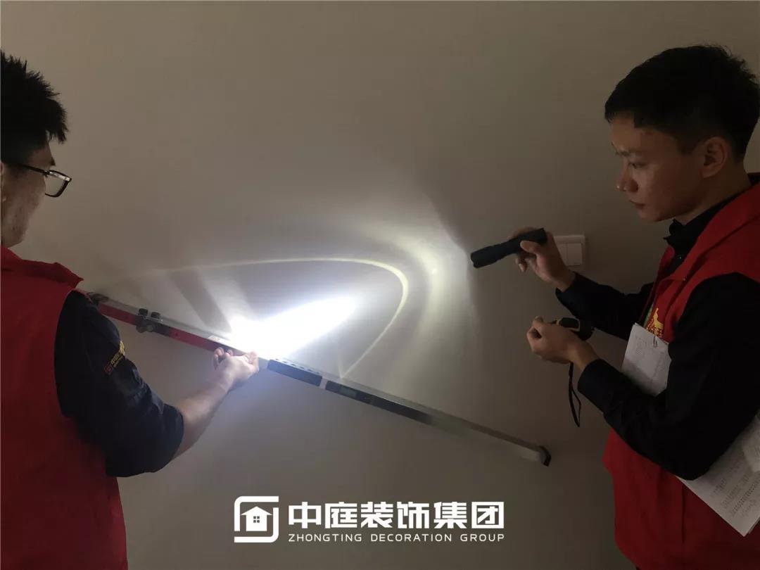 使用強(qiáng)光手電檢查陰角膩?zhàn)邮┕ご蚰デ闆r,工地大巡檢,不放過任何一個角落