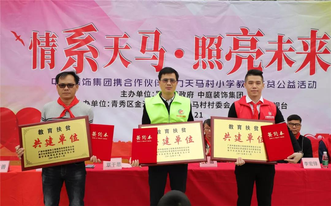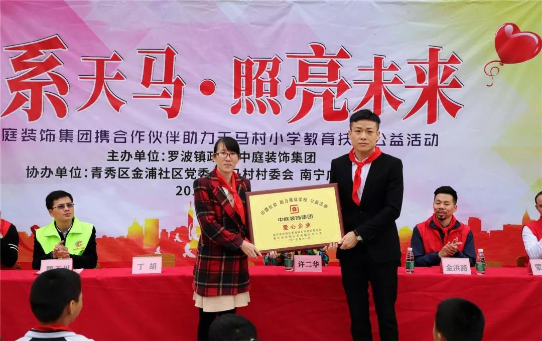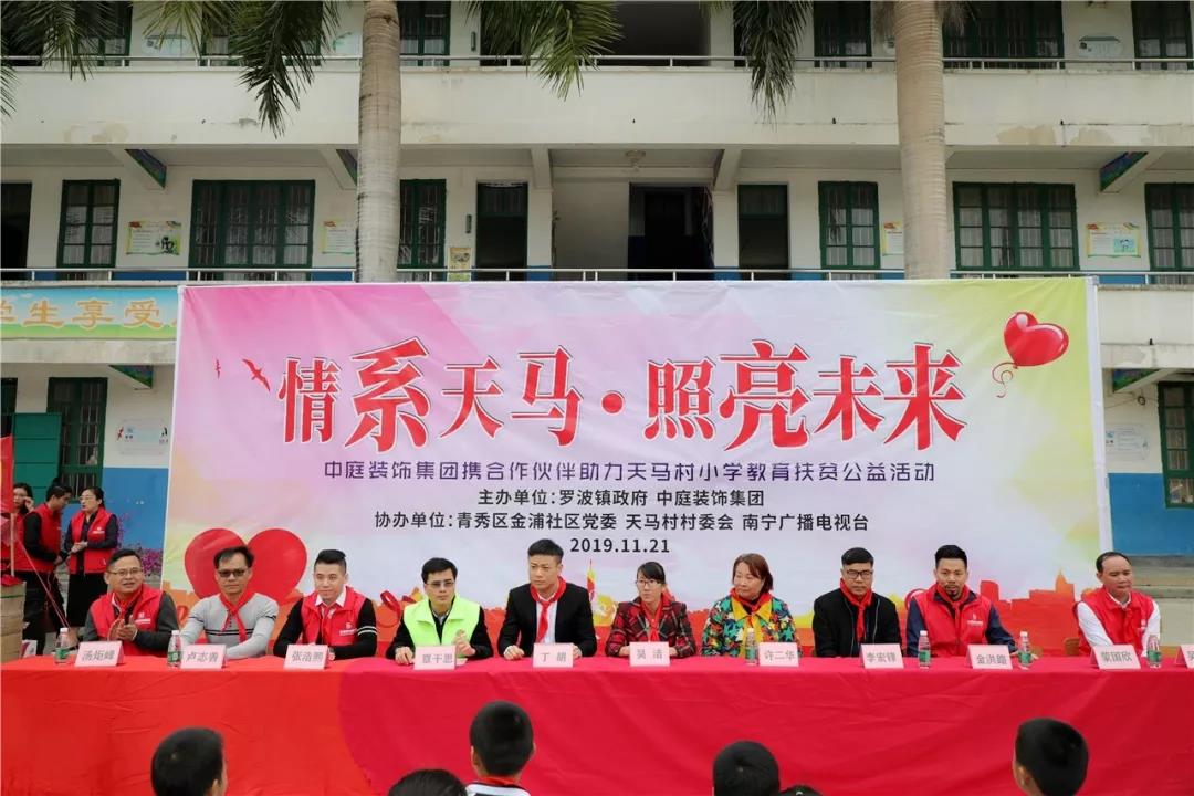 秉承著“源于社會(huì),回饋社會(huì)”的社會(huì)責(zé)任理念,在中庭裝飾集團(tuán)九周年慶之際,集團(tuán)攜手戰(zhàn)略合作伙伴組成愛(ài)心助力團(tuán)前往武鳴區(qū)天馬村天馬小學(xué)開(kāi)展教育扶貧公益活動(dòng)。