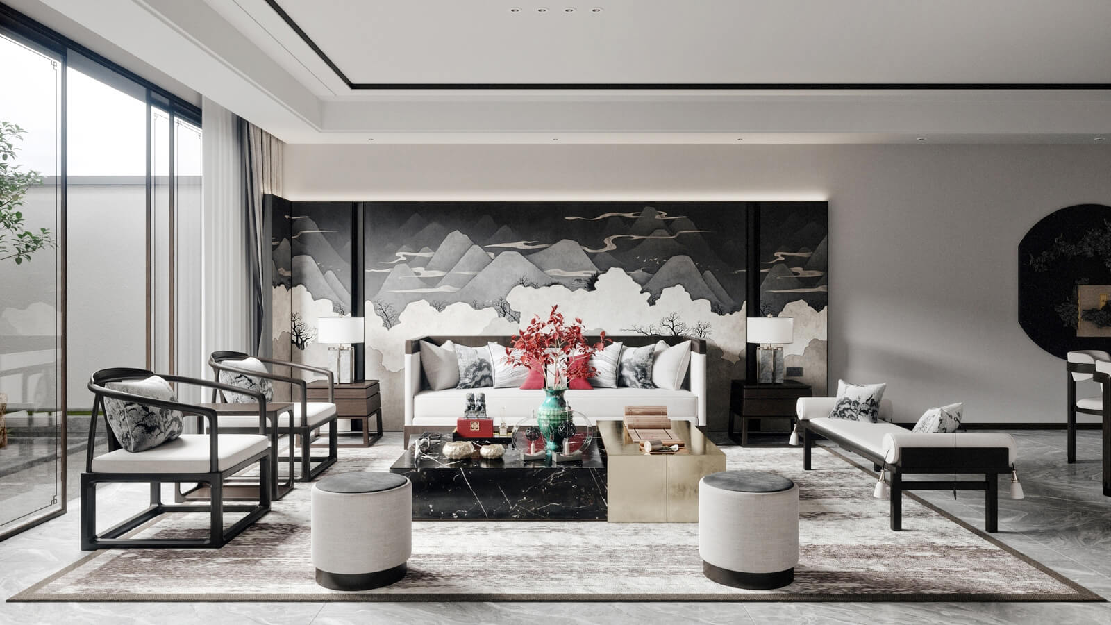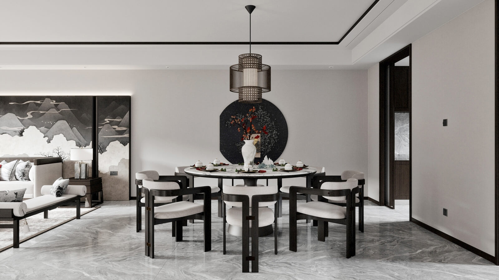設(shè)計(jì)師打破了人們對(duì)傳統(tǒng)中式風(fēng)格的固有觀念,加入了許多現(xiàn)代化的設(shè)計(jì)元素。其中,中國(guó)風(fēng)味一點(diǎn)兒也沒(méi)少。山水畫,瓷器,深色桌椅,這些富含古典韻味的裝飾,完美地與現(xiàn)代化的空間融為一體,體現(xiàn)出靜謐的美感。