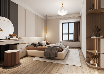 竹炭飾面護(hù)墻板做背景,是大空間設(shè)計(jì)元素在小空間的延續(xù)。主臥沒(méi)有做過(guò)多的造型,大量留白,通過(guò)軟裝設(shè)計(jì)師的巧手來(lái)營(yíng)造氛圍,利用不同色系與材質(zhì)對(duì)比組合形成精致豐盈的裝飾效果,風(fēng)吹簾動(dòng),琉光行云,主臥釋放著樂(lè)且晏如的溫柔情緒